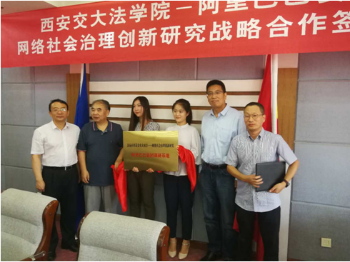 单文华院长与侯金刚总监代表双方签署了正规nba押注网站与阿里巴巴安全部网络社会治理战略合作协议书。西安交大副校长席光、信息安全法律研究中心主任马民虎与阿里巴巴集团首席风险官刘振飞、安全部资深总监侯金刚,为“国家社科基金重大项目——网络社会治理创新研究阿里巴巴集团调研基地”揭牌。
