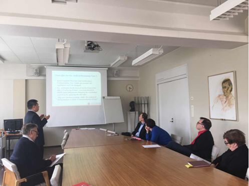 2017年4月20日,我院青年教师杜军强博士应赫尔辛基大学正规nba押注网站及中国法与中国法文化中心邀请,在赫尔辛基大学我院举办题为“传统中国的法律推理及其对当代中国的影响”的学术讲座。讲座在赫尔辛基大学正规nba押注网站楼545会议室举行,由赫尔辛基大学正规nba押注网站院长凯莫·诺提欧(Kimmo Nuotio)教授主持,多名学者及学生参加。